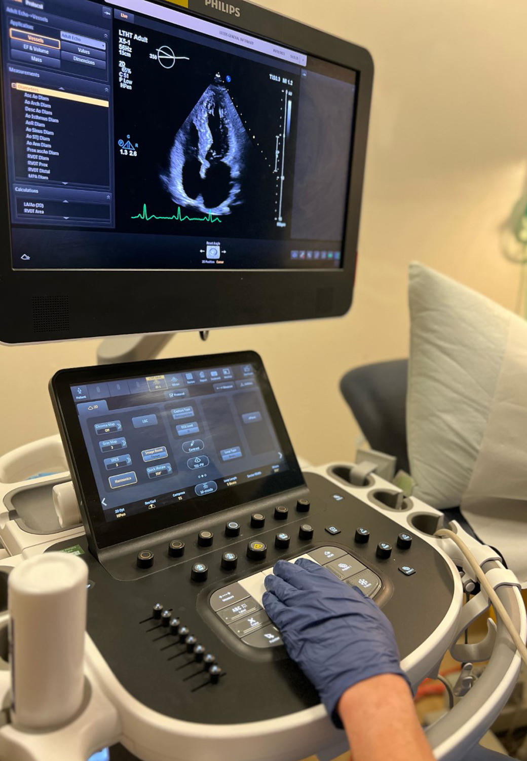 A non-invasive test that uses ultrasound waves to create images of the heart, helping diagnose heart conditions.